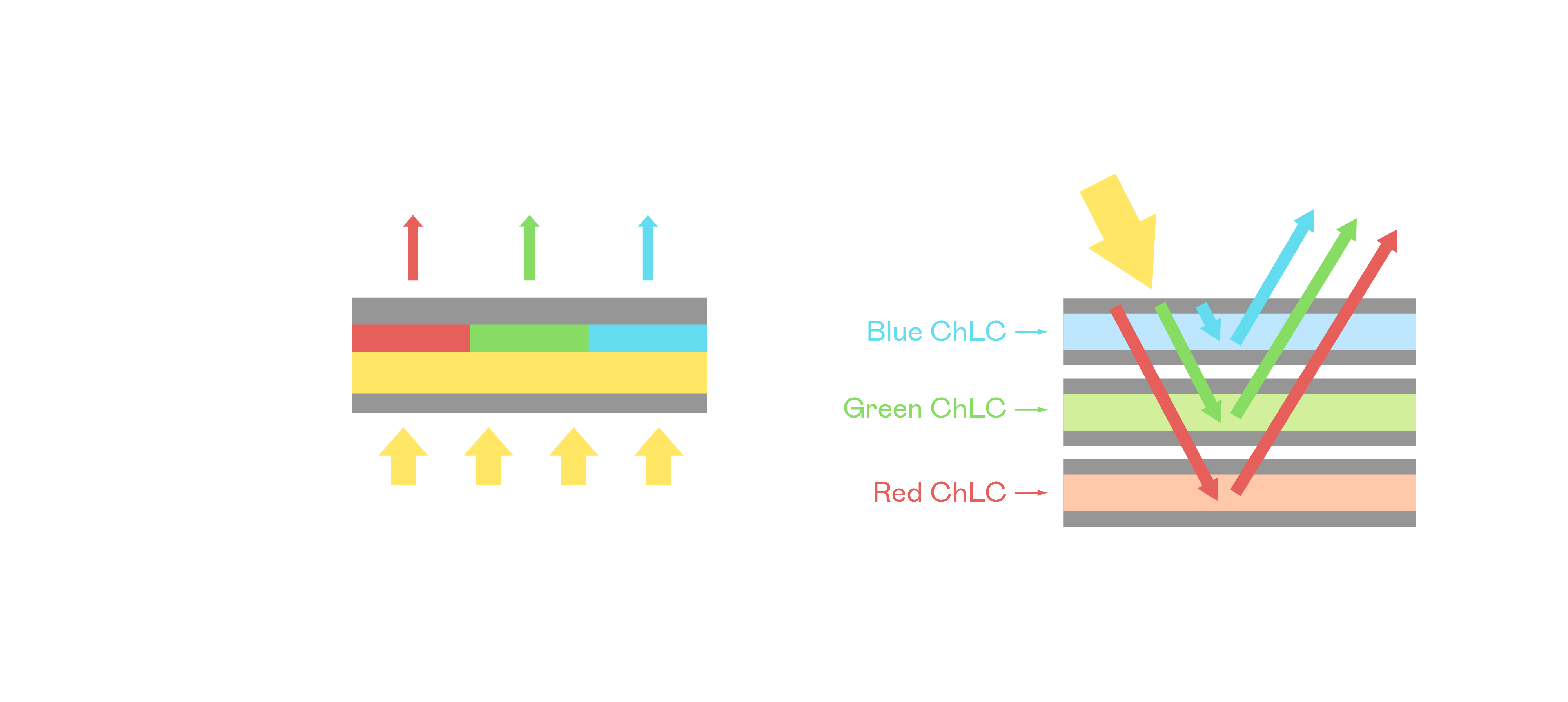星空电子胆固醇液晶显示器是由红、绿、蓝三层胆固醇液晶面板堆叠而成,并采用无彩色滤光片设计,减少环境光在反射过程中的损耗。